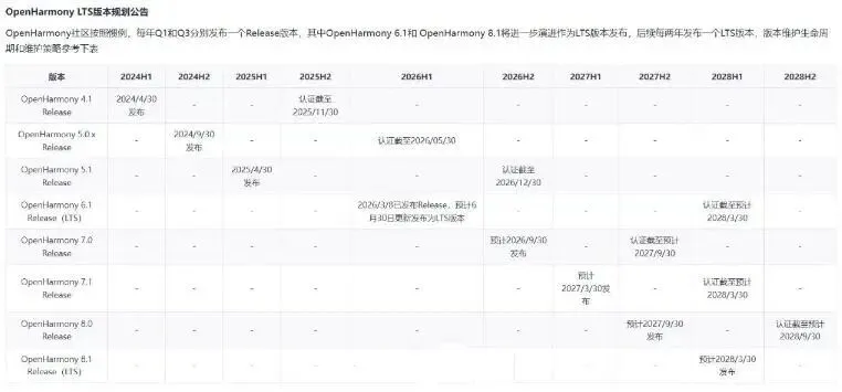 这里机哥给大家科普下,别被LTS和Release搞懵了——Release是功能版,主打上新特性、搞创新;LTS是长期支持版,重点拼稳定、延长期限。这次OpenHarmony 6.1会升级成LTS,认证截止到2028年3月30日,比普通Release版的一年周期长多了。