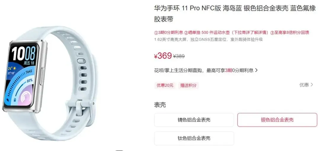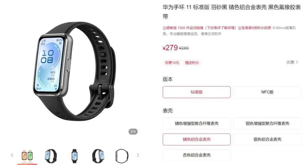 华为手环11系列也包含了多种选择,首先就是华为手环11,它提供了标准版、NFC版,售价分别为269元、319元,首销分别为259元、309元。然后就是华为手环11 Pro,它提供锖色铝合金表壳、银色铝合金表壳、钛色铝合金表壳,售价分别为389元、389元、399元、首销分别为369元、369元、379元。