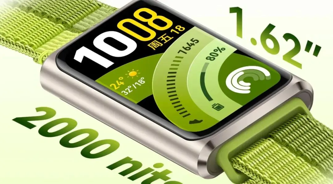 Pro版则直接全系采用铝合金机身,质感比标准版再上一个档次,没有廉价的塑料感,搭配氟橡胶和绿色编织两种表带,氟橡胶款亲肤防水,适合运动出汗多的场景,编织款透气不闷汗,颜值更高,日常穿搭更出彩,Pro版整体定位偏向高端实用,兼顾日常使用和专业运动需求。全系配备1.62英寸AMOLED屏幕,标准版峰值亮度达到了1500尼特,而Pro版更是达到了2000尼特。
