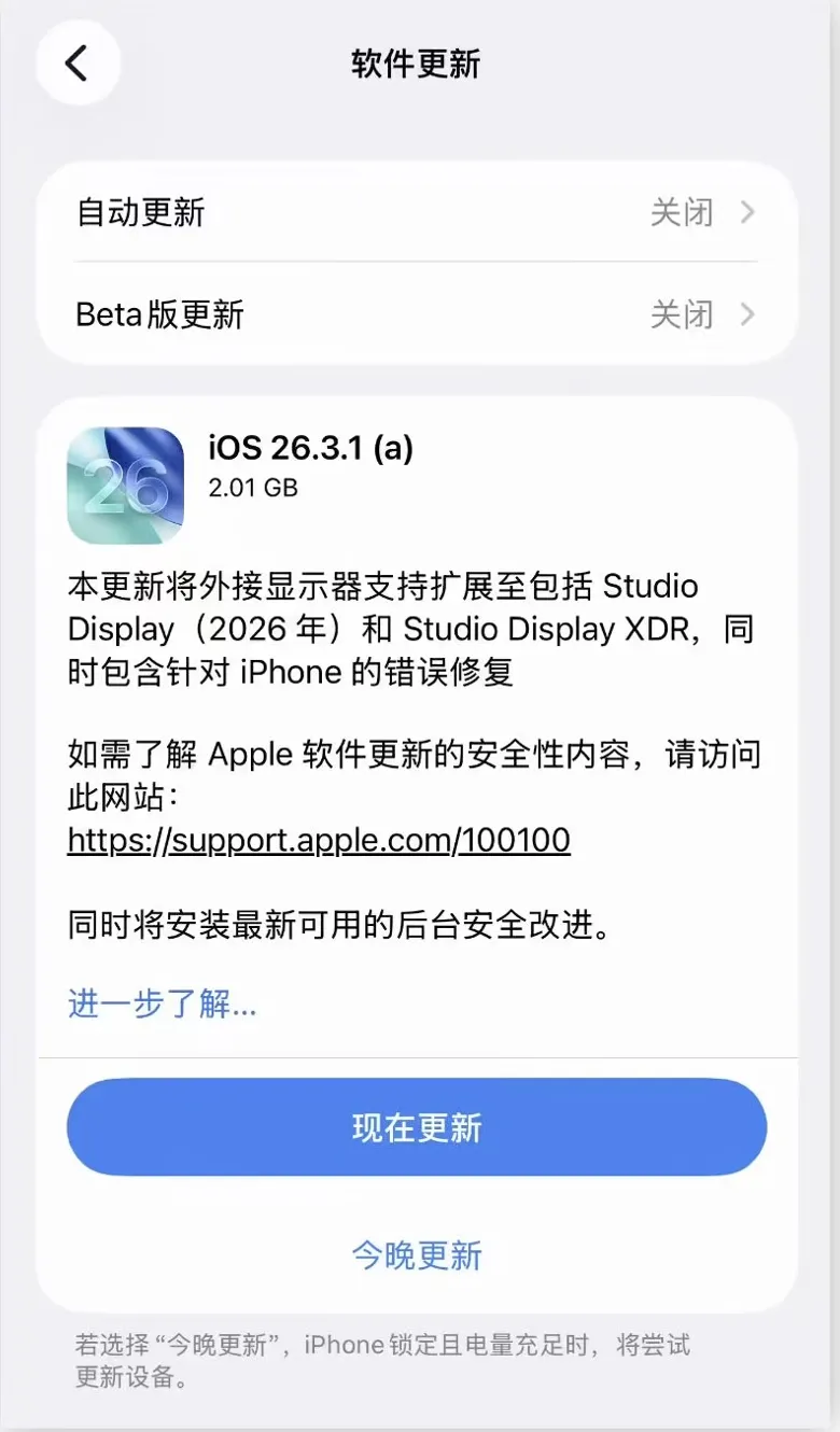 ✅ 还停留在旧版本、准备更iOS 26.3.1的用户:直接升级「iOS 26.3.1(a)」,一步到位