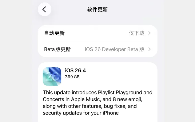 刚刚!苹果发布 iOS 26.4 RC 候选版,疑似下周发布正式版。