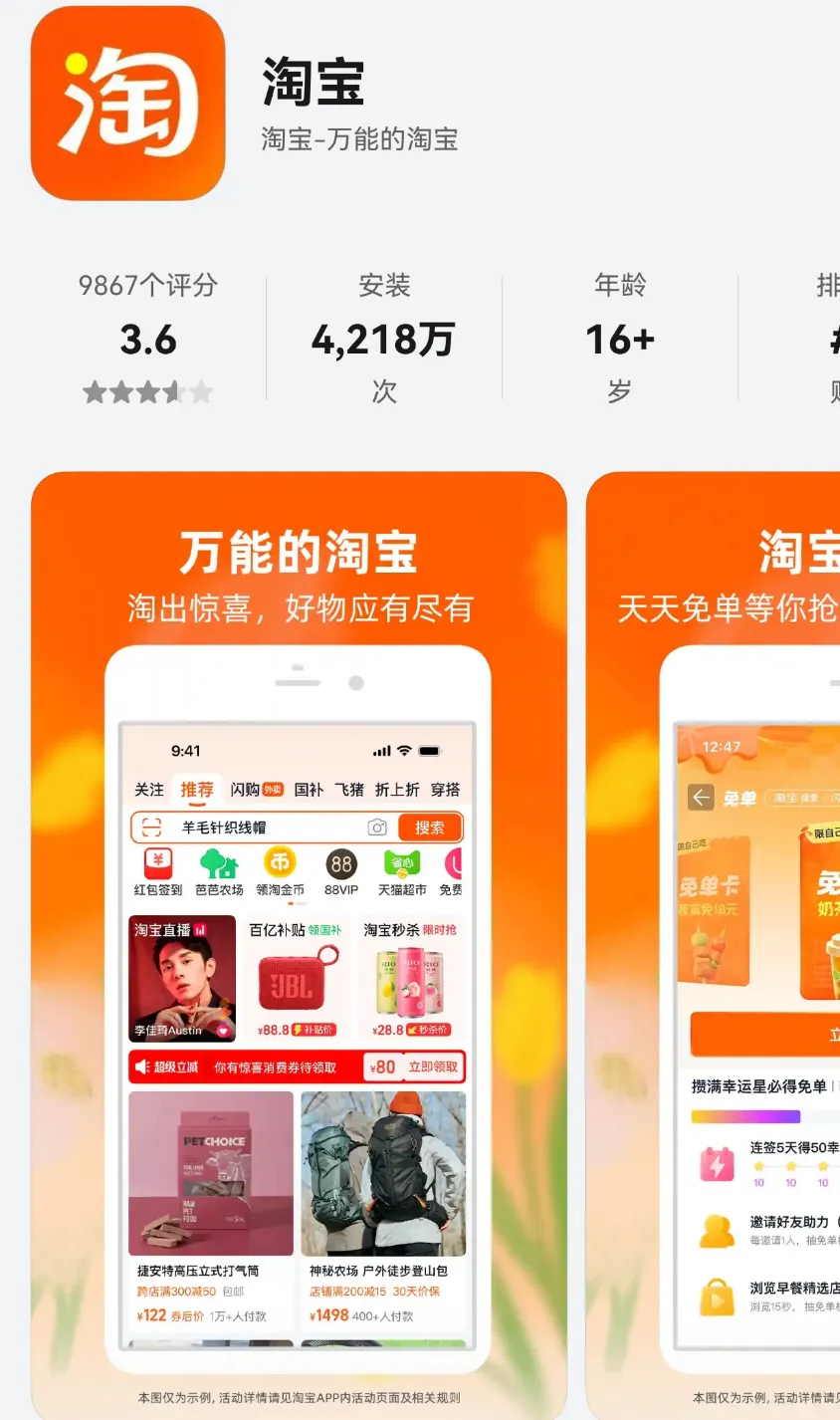 新功能:万能的淘宝:淘出惊喜,好物应有尽有淘宝闪购:天天免单等你抢,外卖红包送不停淘宝秒杀:天天低价,低至5折疯抢百亿补贴:真补贴真优惠淘宝搜索:趋势新品,品质好货,一搜即得购物清单:逛购物清单,万千好物一站式购齐