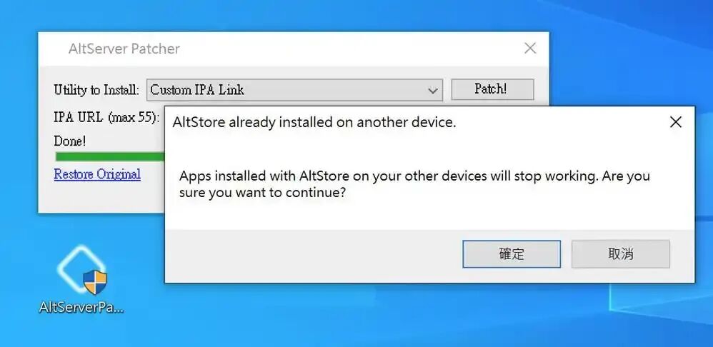 步骤5:确认好要安装的IPA 后,点击「Patch!」按钮,这时会跳出一个AltServer has been patched to install that IPA.. 对话框,点击「确定」