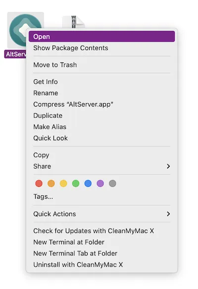 在macOS Bigsur上运行AltServer.app, 系统在默认情况下会禁止不是从App Store中下载的软件运行,因此,我们在软件上点击右键, 选择"打开",或者是"Open",如下图:三. 安装AltStore到手机