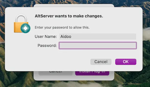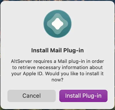 使用上面的方法绕过限制后,就可以安装altstore到手机上了。在系统的右上菜单栏中点击altserver的图标,选择安装AltStore ("Install AltStore"), 选择你已经连接到电脑的手机。此时AltServer会要求你输入你的Apple Id与密码,在这一步如果你担心你的帐号密码泄漏,建议你新建一个专门用来玩游戏的账号来操作。如果你是刚安装的AltServer, 则它会要求你安装一个邮件插件,这个插件会用来操作与Apple服务器之间的邮件接收(用于发送接收验证码,证书验证相关操作):出现这个画面,则点击"安装插件"("Install Plug-in"),点击后安装插件需要管理员权限, 如果显示密码输入框,则输入你的操作系统登陆密码。安装完成邮件插件后,我们重新安装AltStore到手机(参见"三. 安装AltStore到手机")。必须安装这个插件才能使用四. 启用邮件通讯插件