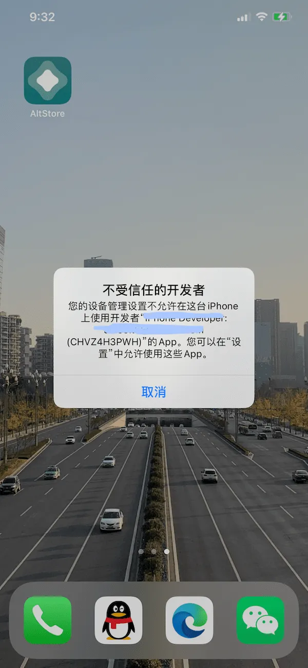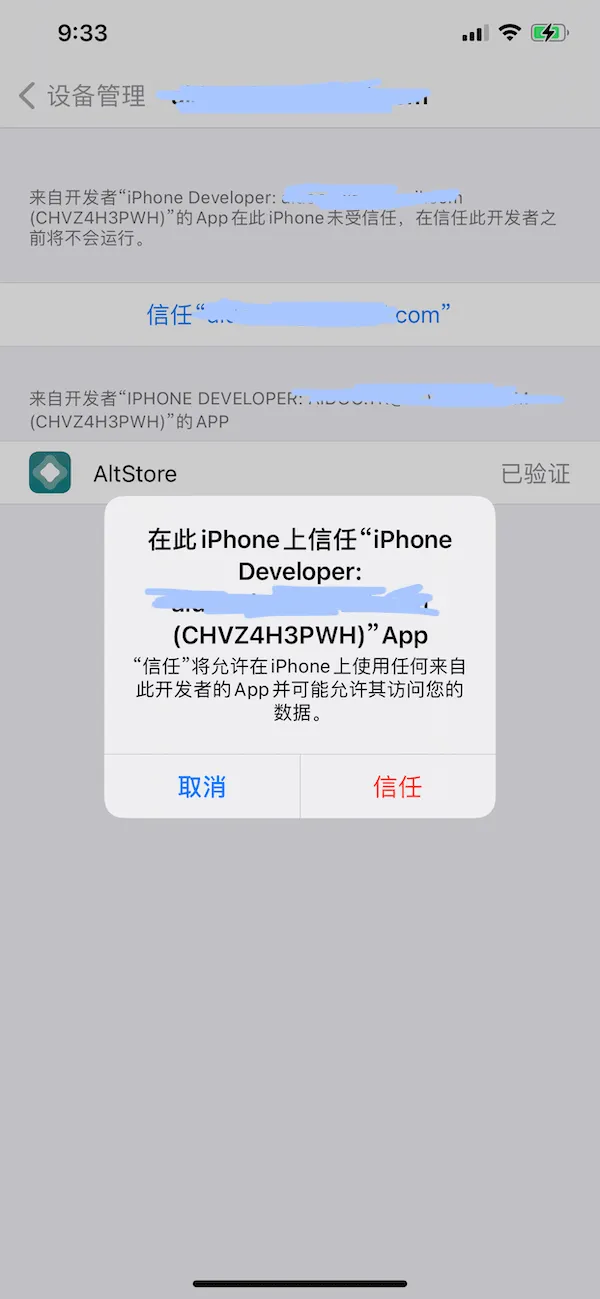 操作完以上步骤后,AltStore就会成功地安装到我们的手机,点击手机上的AltStore的图标,有可能会弹出下面的错误框, 这是因为AltStore采用的我们自己的Apple ID对应的免费开发者证书签名,需要我们在手机上信任这个证书后才能运行。找到“设备管理”,点击进入。然后找到对应的签名,点击"信任"。操持电脑端的"AltServer"与"Mail"处于运行状态。 返回手机桌面,找到"AltStore"并运行,此时便可以运行"AltStore"了。输入安装 AltStore 时用的 Apple ID 并登陆。登陆完成后便可以在 AltStore 中直接安装里面列出的应用。六. 自签名IPA