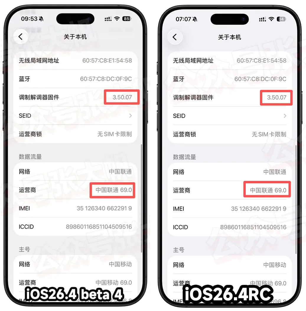 以 iPhone 15 Pro 为例,更新后调制解调器为 3.50.07,运营商版本为 69.0 和 Beta 4 一样没变化!