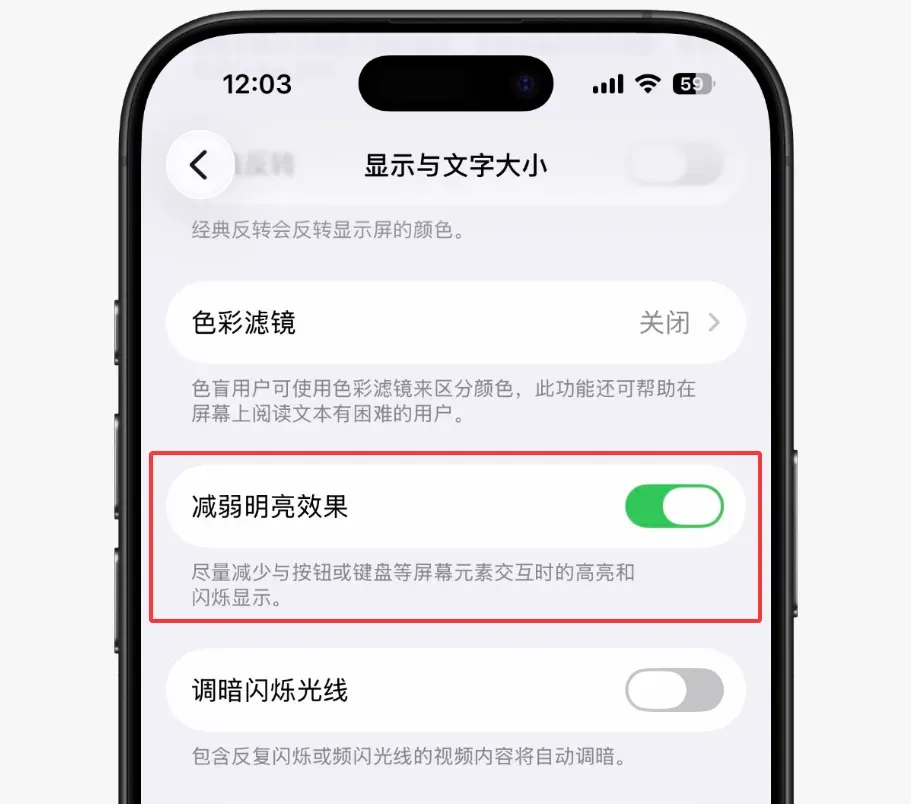 苹果在辅助功能里新增L 一项「减弱明亮效果」的新功能。根据苹果描述,开启后将尽量减少与按钮或键盘灯屏幕元素交互时高亮和闪烁显示;