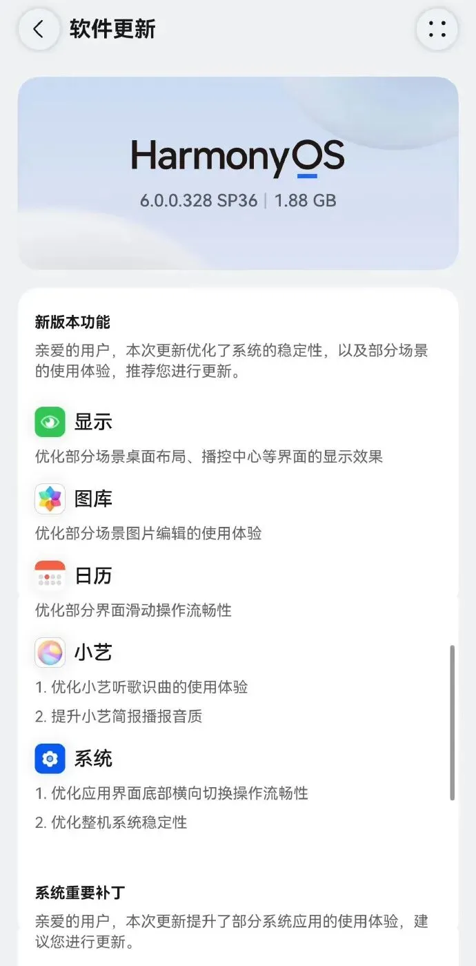 先给大家划重点:这次鸿蒙6.0.0.328 SP36版本,定位就是“体验补丁包”,全程聚焦“稳”和“顺”,更新包体积约1.88GB,属于常规维护性升级,但每一项优化都精准命中用户此前反馈的痛点,实用性拉满。
