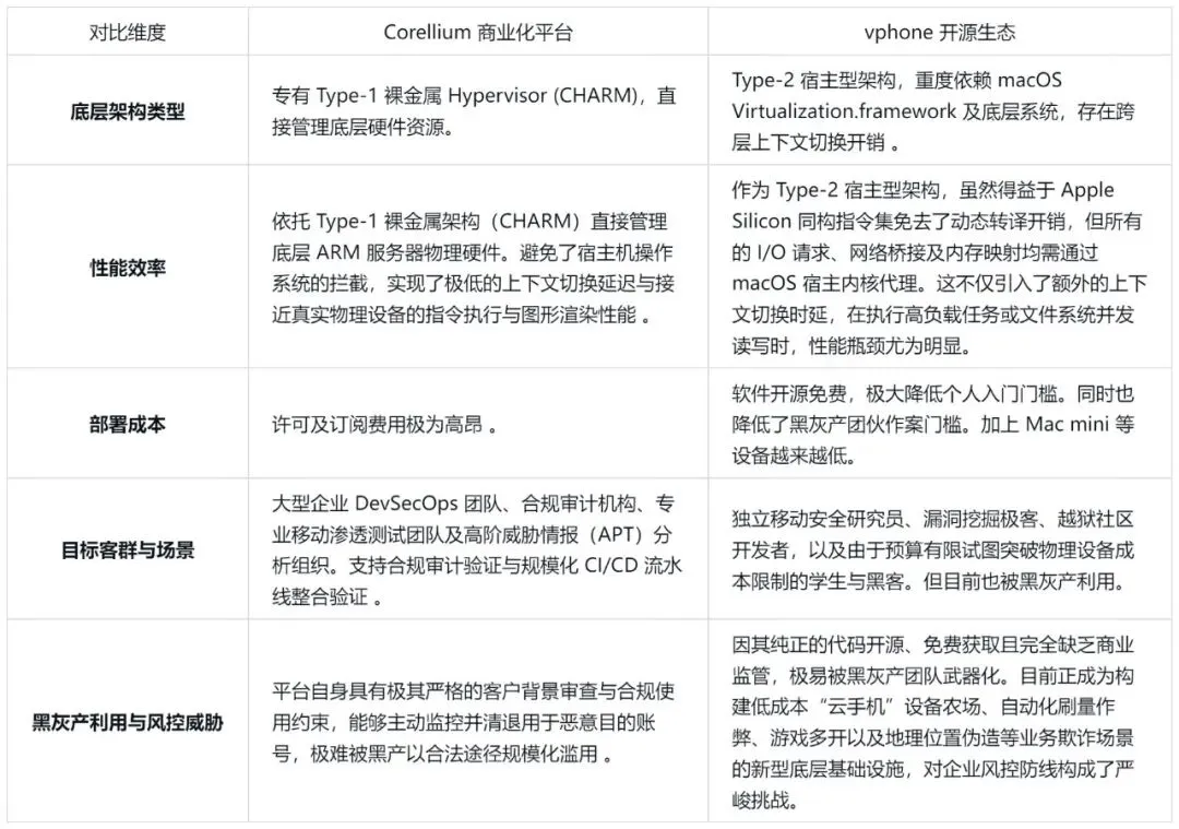 虚拟化技术不仅是底层代码的博弈,其产品化路径直接决定了它在真实网络生态中的应用走向。由于 Corellium 与 vphone 处于完全不同的商业与开源象限,它们在使用场景、产品落地以及对黑灰产生态的衍生影响上存在着巨大的鸿沟。