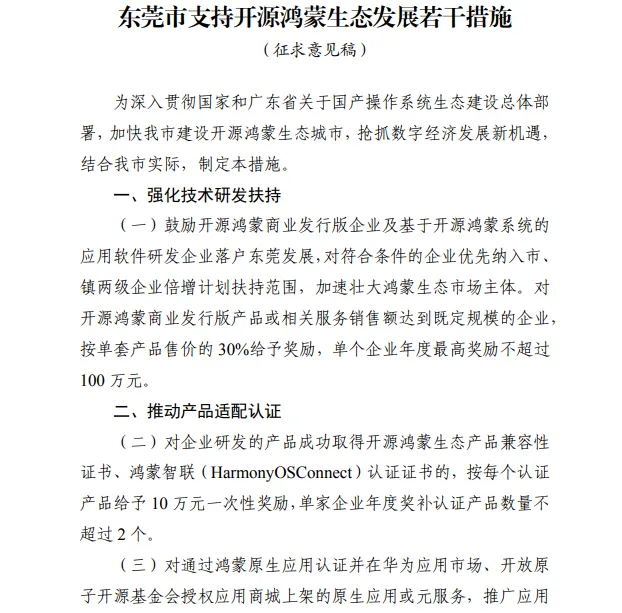 今年,市委将建设开源鸿蒙城市列入全市十大亮点工作。为贯彻市委市政府工作部署和市领导指示精神,加快我市建设开源鸿蒙生态城市,抢抓数字经济发展新机遇,我局草拟了《东莞市支持开源鸿蒙生态发展若干措施(征求意见稿)》,现向社会各界人士公开征求意见和建议。意见征集时间为2026年3月19日至3月27日,意见反馈邮箱为dgetb_xxcy@dg.gov.cn。为便于联系,请提交意见和建议时同时提供联络人姓名和联系电话。