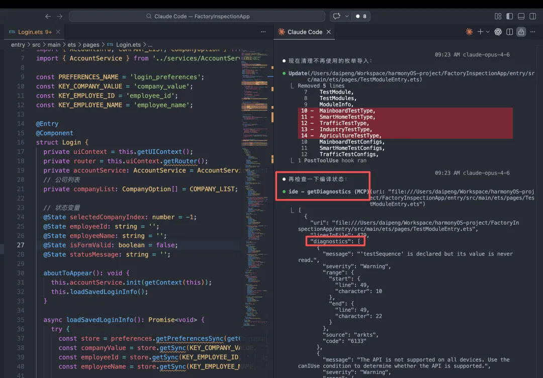 HarmonyOS-ArkTS 插件最关键的功能是提供实时诊断,然后 Claude Code 通过 MCP 工具能拿到这些诊断信息,等于 AI 能"看到"你代码里的类型错误。