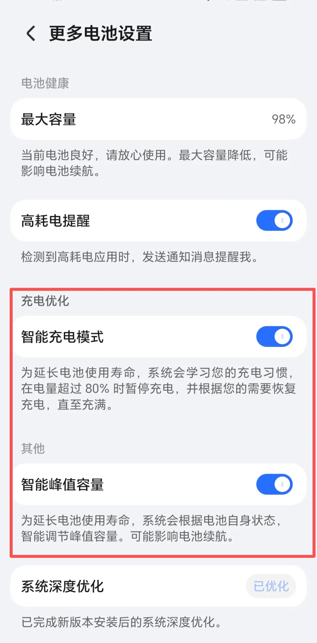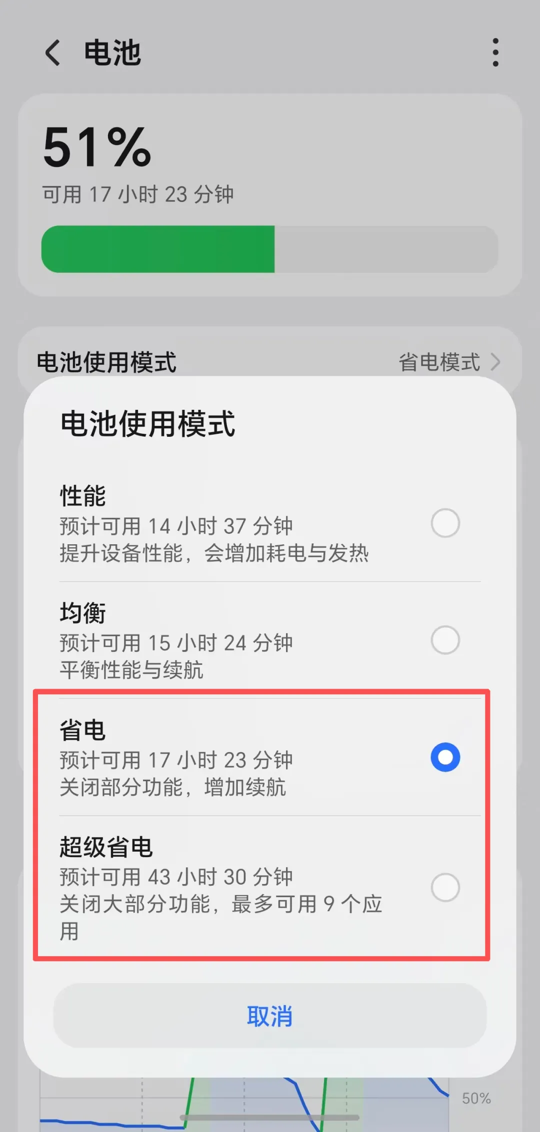 第二点要调整的地方在系统设置里面,打开手机的设置应用,找到【电池】相关的选项点进去,再选择【电池使用模式】,就能看到【省电模式】或者【超级省电】的开关,把这个开关打开之后,系统会自动把后台不必要的运行程序限制住,让充电过程不会被一边充一边大量耗电的情况拖慢速度,电量只剩下 10% 左右又需要临时使用手机的时候,把超级省电模式开启会更合适,只有电话、微信这类常用软件能被保留运行,其他费电的功能都会被关掉,充电的效率还能进一步提升。