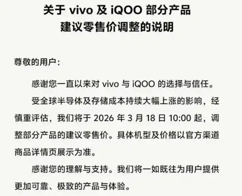 vivo宣布:受全球半导体与存储成本持续上涨影响,部分机型全面调价。