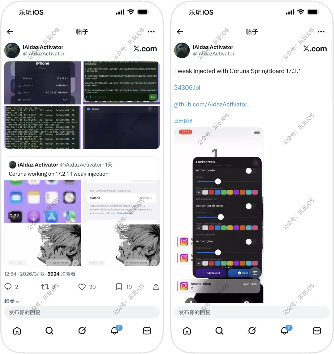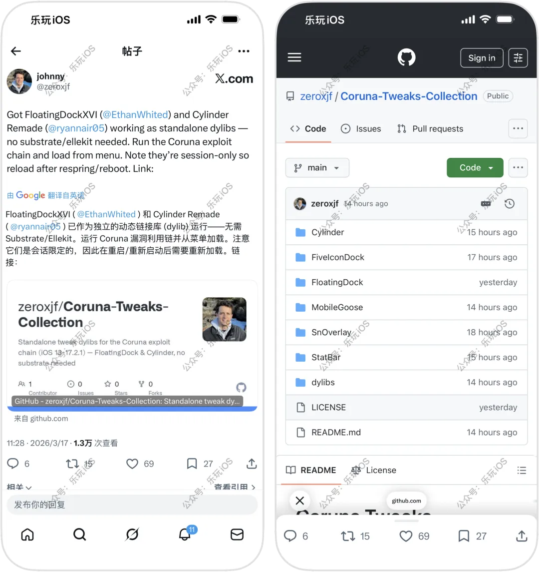 此前大佬 Huy Nguyen 发布了Coruna 工具网站,支持 iOS 13.0 - 17.2.1 系统,其中支持通过 Safari 网页安装巨魔,但仅限 iOS 14.0 - 16.6.1/17.0Coruna 工具网站:http://34306.lol近日,大佬 Johnny 研究针对 Coruna 工具网站进行了插件兼容优化,发布了 Coruna 工具网站可用的插件,主要作为独立的动态链接库运行,注入即可生效,无需 Substrate/Ellekit大佬 iAldazActivator 也针对 Coruna 网站发布了一款 TweaksLoader 插件,内置超多功能1、FloatingDockActivator > iPad风格的Dock栏2、CylinderActivator > 桌面图标翻转效果3、SnOverlayActivator > 全局雪花飘落效果4、FiveIconDockActivator > Dock栏可显示5个5、StatBar > 状态栏显示电池温度和内存使用情况6、MobileGooseActivator > 一只不停跑动的鹅7、TweaksLoader > 工具箱/终端/Nugget移植功能https://github.com/zeroxjf/Coruna-Tweaks-Collection