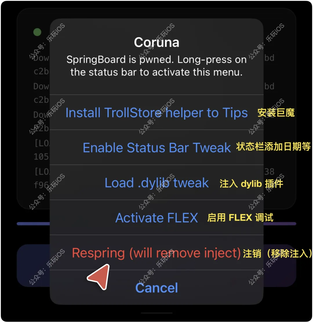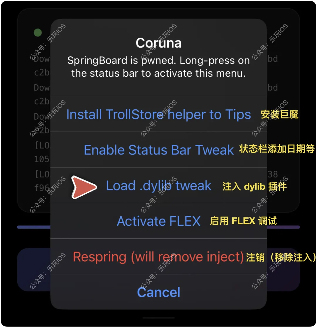 2、Safari 打开 Coruna 工具网站,点击 jelbreak me3、激活成功后,弹窗中点击 Load.dylib tweak方法一:长按左上角时间,弹窗点击 Respring,注销即可1、主要适用于无法越狱的设备,已经越狱的就不要尝试了,避免出现问题2、如果Coruna工具网站中点击 jelbreak me 会卡住,建议重启尝试,如果还不行建议放弃,毕竟是初始版本,可能不稳定,等待完善4、目前可用的插件不多,玩玩可以,不喜忽略即可,继续期待opa334有突破,可以带来 iOS 17.0 - 17.2.1 的完整越狱▽ 点击下方进入玩机库 ▽