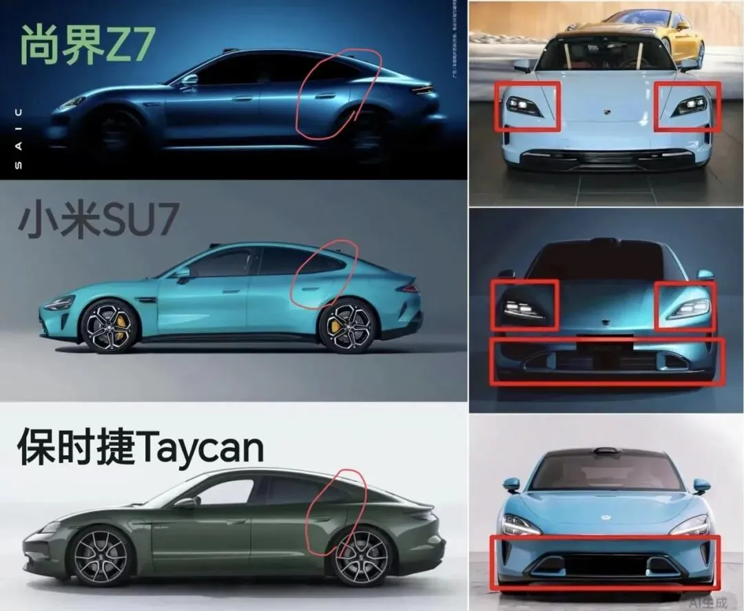 坦白说,两款车在外观上的相似度确实很高——都是低趴溜背、无框车门、贯穿式尾灯。有网友调侃“完全就差个标不一样的感觉”。但这背后其实有一个共同的设计源头——保时捷Taycan的设计语言,在中高端纯电轿跑中已成主流。