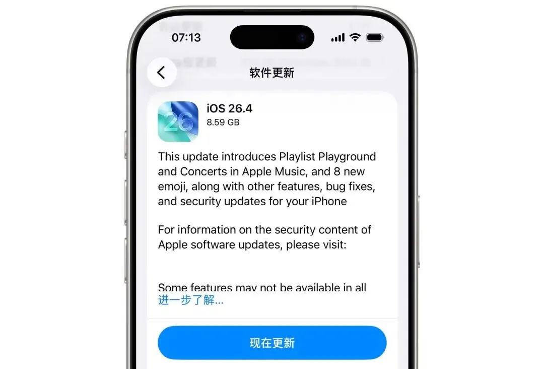 这几天很多iPhone屏幕上跳出同一条提示,夜里推送来的那个包一眼能认,苹果把iOS 26.4发给符合条件的机型,版本号写着24E5219a,大小大概1.2GB,点开说明能看到几件事,失窃设备保护默认打开,设置里多了减弱明亮效果,Apple Music里出现AI的播放列表游乐场,设置应用里红点也亮起,通用和软件更新那一页把下载和安装的按钮摆好了,点下去等进度条走完就能上手用起来。