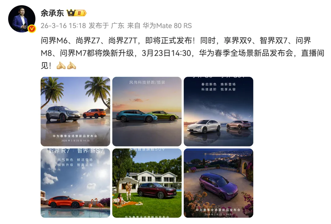 除了智慧家庭,鸿蒙NEXT在“车”端的进展同样迅猛。3月16日,华为常务董事余承东官宣,问界M6、尚界Z7等三款全新车型将在春季发布会上亮相,同时多款在售车型也将同步焕新。本次密集发布,本质上是鸿蒙智行2026年百万销量目标的具体落地。在技术层面,鸿蒙智行搭载了业界量产最高的896线激光雷达,感知能力实现质的飞跃。软件上,ADS 4.1领航辅助驾驶系统覆盖了乡村窄路、山区小路等复杂场景,让汽车不再是单一的出行工具,而是成为人车家互联的重要枢纽。