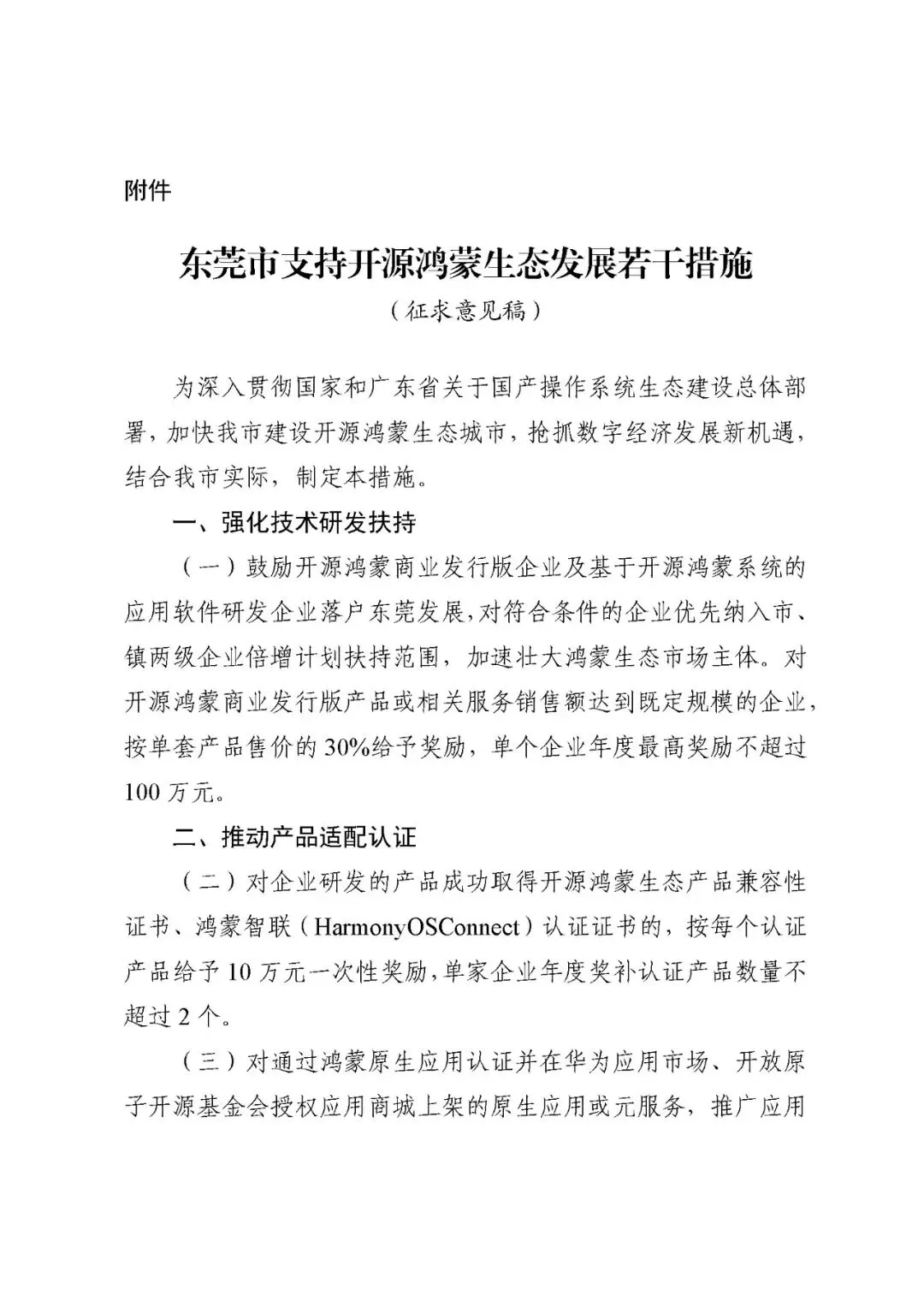 今年,市委将建设开源鸿蒙城市列入全市十大亮点工作。为贯彻市委市政府工作部署和市领导指示精神,加快我市建设开源鸿蒙生态城市,抢抓数字经济发展新机遇,我局草拟了《东莞市支持开源鸿蒙生态发展若干措施(征求意见稿)》,现向社会各界人士公开征求意见和建议。意见征集时间为2026年3月19日至3月27日,意见反馈邮箱为dgetb_xxcy@dg.gov.cn。为便于联系,请提交意见和建议时同时提供联络人姓名和联系电话。 受理单位:东莞市工业和信息化局软件和信息服务业科(人工智能科) 地址:东莞市南城街道鸿福西路 68 号塞纳嘉园二楼 附件:东莞市支持开源鸿蒙生态发展若干措施(征求意见稿)查看附件 👇