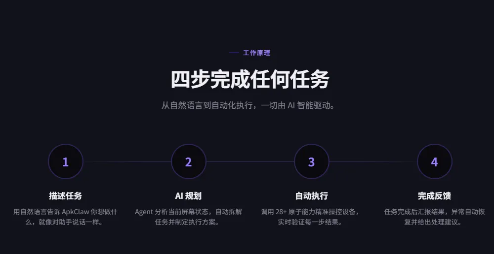 ApkClaw四步就能搞定所有事:用自然语言说需求→AI分析屏幕自己规划步骤→调用28+种原子化能力自动操作→做完事给你汇报结果。哪怕是复杂的应用操作也能一步步拆解开,主打一个省心。
