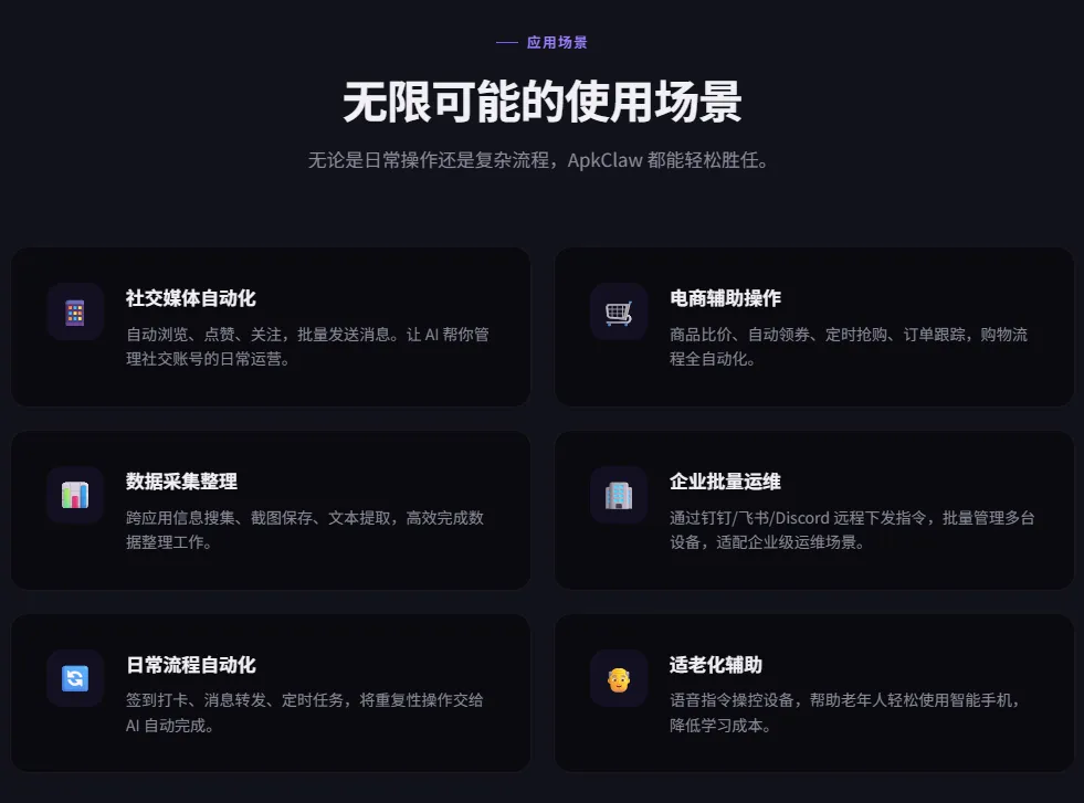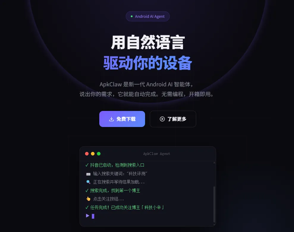 说到底,咱们用智能设备本来就是为了省事,结果反而被各种琐碎操作绑住,而ApkClaw就是让AI替你干活,你只管躺平。直接冲官网https://apkclaw.ai/ ,体验一波让手机自己打工的快乐,谁用谁知道有多香。