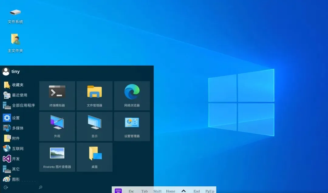作为PC应用引擎使用,tiny_computer界面设计十分贴合国内用户习惯,XFCE版本内置了来自kali-undercover的Win10主题,熟悉的桌面布局、开始菜单、文件管理器,几乎没有学习成本。