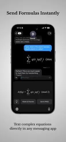 LaTeXBoard 的使用流程极度简化,无需专业的 LaTeX 操作经验,打开聊天软件就能快速上手:切换至 LaTeXBoard 键盘 → 点击「粘贴并预览」生成公式 → 确认后点击「发送 PNG」→ 粘贴图片至聊天框发送,三步就能完成公式传递。