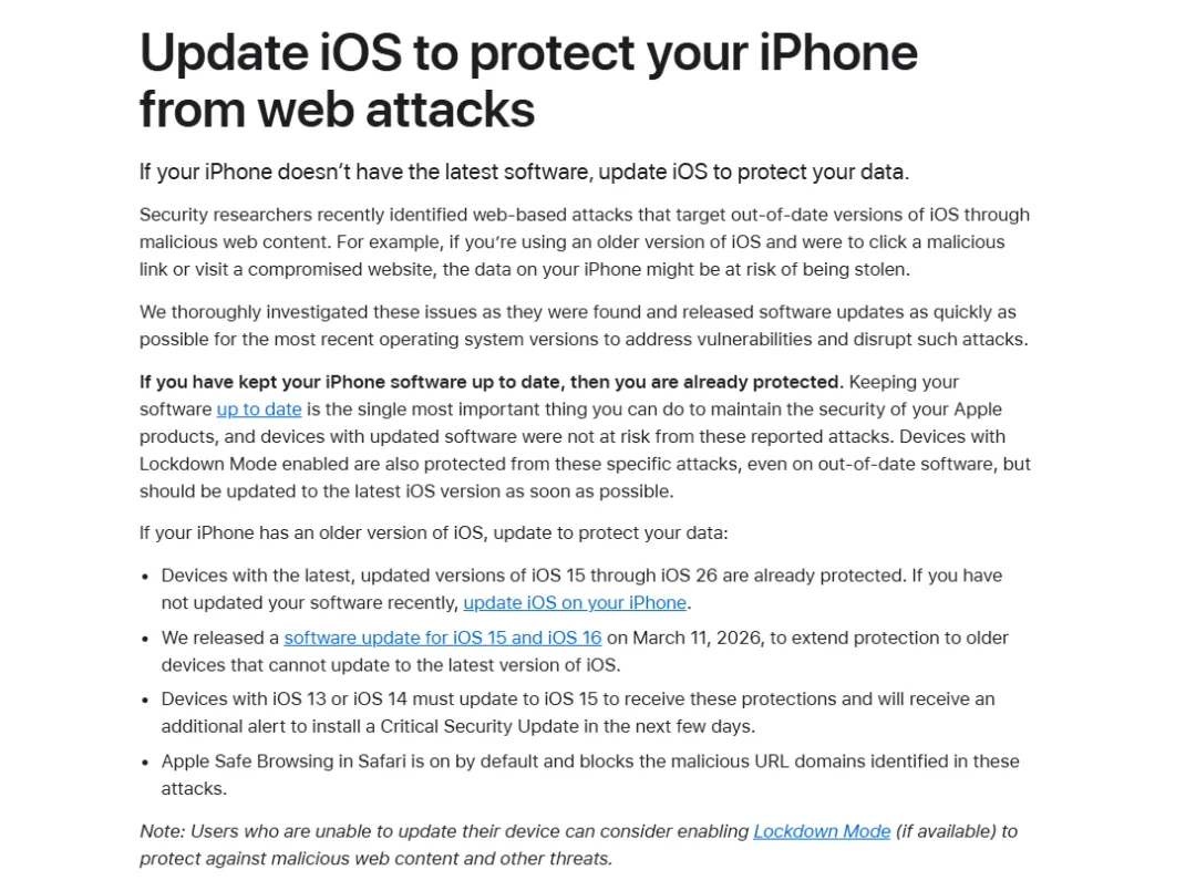 在3月19日上午时段,苹果官网发布一条公告,公告标题为:更新 iOS 以保护您的 iPhone 防止网络攻击,内容是:安全研究人员最近发现了一些针对过时版本iOS的基于网络的攻击,这些攻击通过恶意网站内容进行。