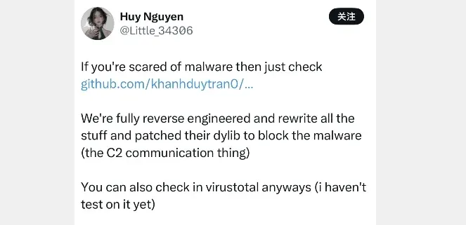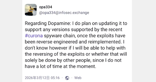但从技术上来看,不确定有没有完全拦截或者阻止原有 DarkSword / Coruna 网页漏洞动态接口,这就存在一些风险性的问题,针对 Coruna 漏洞利用,Little_34306 开发者在 X 上回应,已经解密拦截。