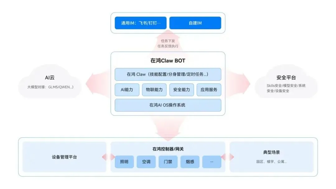 这款搭载AI能力的专属BOX,以开源鸿蒙为技术基底,以自研在鸿OS的AI框架为核心支撑,深度集成OpenClaw智能执行能力,还融合了鸿蒙软总线、多协议适配等核心技术优势,像为智慧空间装上了一颗“智能大脑”,打通了设备互联与智能执行的技术链路,实现对空间内照明、空调、门禁、烟感等全设备的统一接入与智能管控,让传统物联方案完成智能化升级。