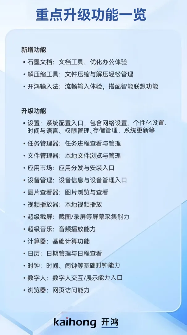 KaihongOS 5.0是基于OpenHarmony深度定制、专为PC桌面场景设计的操作系统,并非手机系统的简单放大。