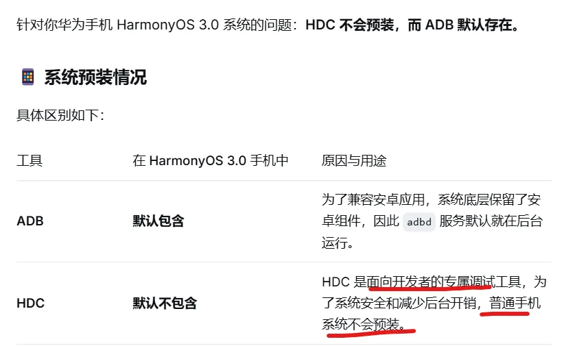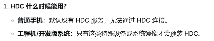 经过断断续续一个周的折腾,终于能让华为nova8 harmony3.0的手机连上开发工具DevEco Studio了。有个感想: AI可以作为我们编程路上的好助手好工具,但是复杂问题还得靠开发者动脑子根据助手给出的材料综合判断得出解决思路。最近用华为nova8 se手机系统版本harmony3.0开发APP 开始准备连接Android Studio直接在devices里面看不到通过网上一通搜索,发现华为出了一个hdc的东西和安卓的adb是一样的功能。首先介绍下这两个东西是干嘛的:他们是一个随着studio启动而启动的server 是连接手机和电脑的中间人,就像我们平常开发的后端服务是一样的,有进程有端口,android开发时会在任务管理器里看到adb.exe,默认端口是5037。hdc的端口是8710,然而我想说的是这个hdc跟我们普通开发者并没有什么关系,不用在这上面下大力气,去找手机连不上电脑的原因了。就算是DevEco Studio连上了手机 hdc list targets命令还是看不到手机,其实看不到是对的 我查了一下DeepSeek 普通手机用不上hdc下图是DeepSeek回答截图如下,所以也不用在hdc上使劲了我问DeepSeek手机上会预装hdc daemon吗,答案是不会。(daemon就是手机上运行的客户端)目前我的nova8上装的是adb daemon。(adb 连接server的客户端)这个hdc没啥关系,但是它顺带着启动的HdcExternal.exe才是我们要关注的,它启动的是兼容adb的服务,可以冒充adb,这个东西是我们应该关注的东西。实际上DevEco Studio并没有adb,也不会启动adb服务,而Android Studio是有adb服务的。所以这里你在命令行里怎么折腾adb也没用,启动的adb server根本和DevEco 没半毛钱关系,比如你会从网上搜索到的各种命令 adb kill-server; adb start-server; adb devices;在这上面用劲没有啥效果,搞得自己焦头烂额【希望看到的兄弟们不要再走我的老路】。环境变量设置HDC_SERVER_PORT端口,这个端口就是模拟adb server的端口7035,可以任意设置【hdc的端口还是8710】,如下图这里为什么要设置固定端口呢,因为不设置的话,这个端口是随机的,随机的就没法设置防火墙入站规则,有个这个规则,手机就可以访问到电脑的这个端口,就可以模拟adb通信了,最终就连上了,device框里就能看到了。还有个小技巧:就是如果拔下数据线,再插上看不到,那就重新关闭再打开USB调试选项,我猜测这是启动手机端的daemon的开关。