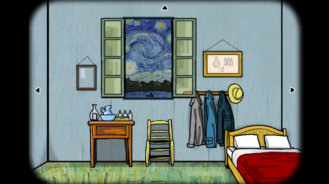 3、方块逃脱:阿尔勒这作里面都是梵高的元素,整个游戏和梵高的《卧室》布局一模一样。梵高耳朵里的世界,盛开的向日葵,高更的画板,以及最后推开门,眼前的那一片星空。