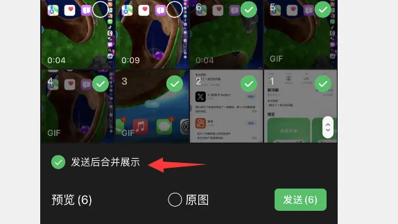如果你被灰度上,勾选超6张图片发送时,它会弹出合并展示按钮,只要你勾选此按钮,发送后的图片就会合并折叠起来,只需要左右滑动图片即可预览图片。