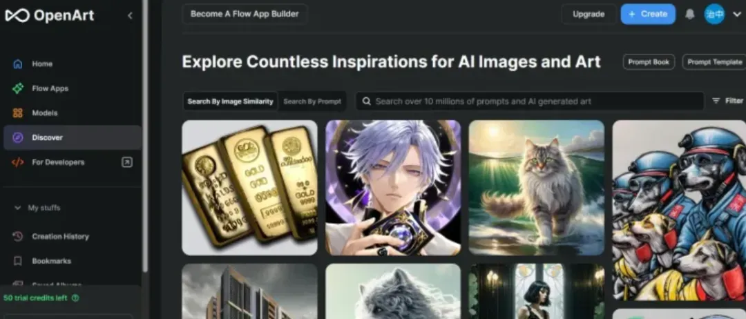 关键它注册还送500 积分,可以生成500 张图片,适合手残党训练使用。它的网站还有很多公开的图片Prompt,可以参考模仿。