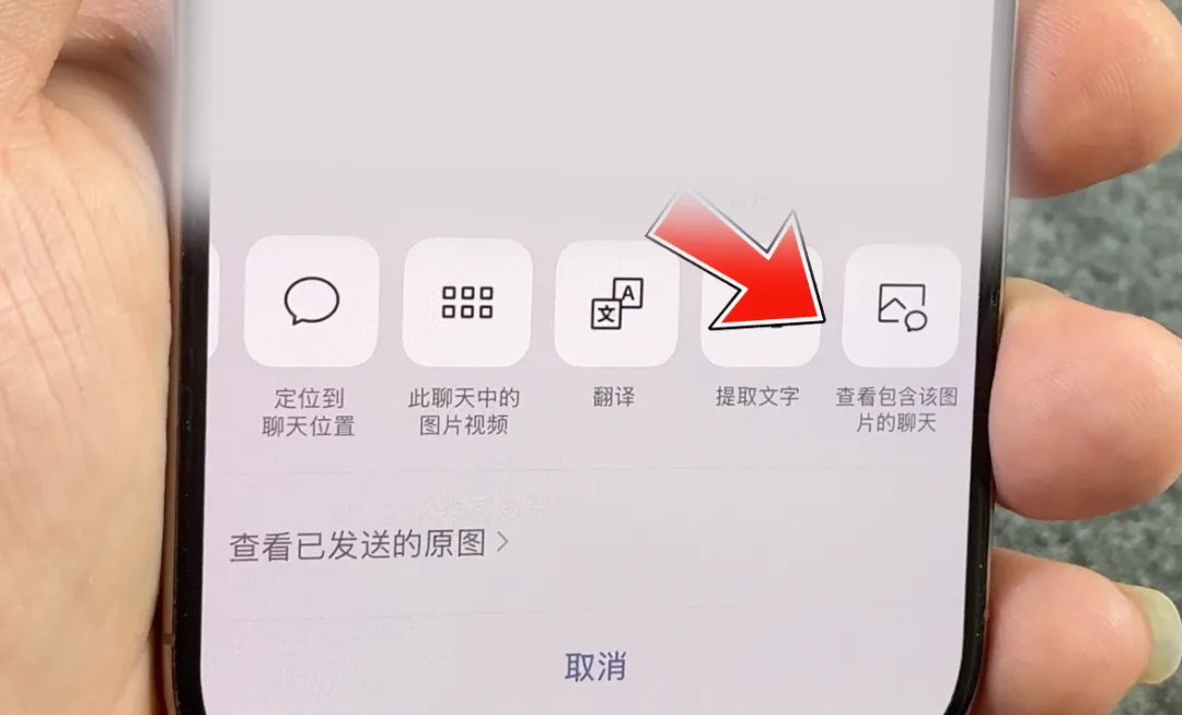 如果你想知道这张图片还发送过给哪些人,很简单,点击这张图片,然后长按它,最后将第三行扒拉到最右侧,你就会看到这个新增的「查看包含该图片的聊天」。