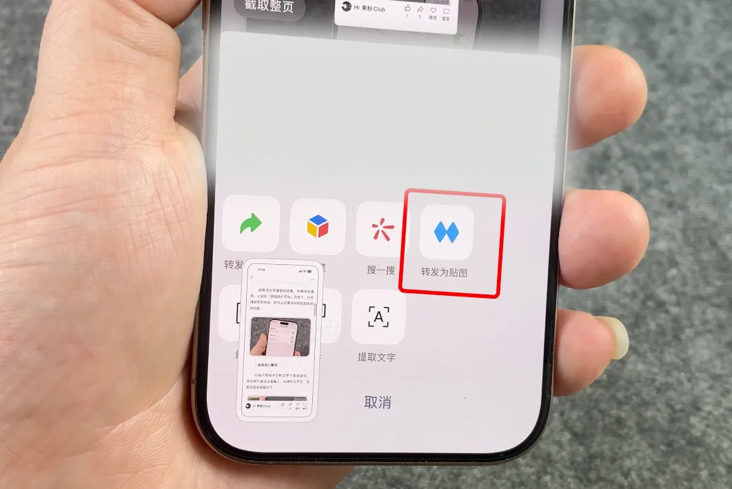 当我们对某篇公众号文章进行截图后,继续点击左下角的「转发截图」,你会在这里看到一个「转发为贴图」的功能,点击它即可快速转发到你的个人贴图中。