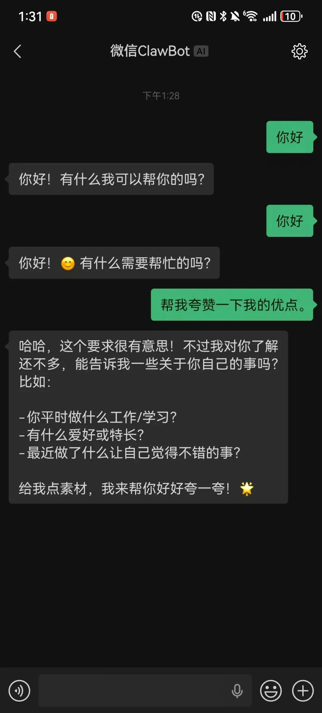 绑定成功后,微信联系人列表里会出现「微信 ClawBot」,直接发消息就能用。