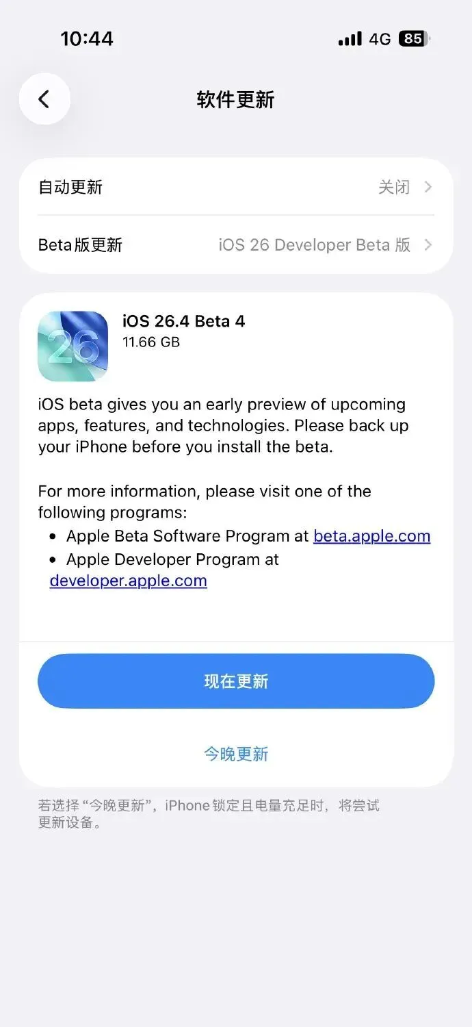 相机应用加了个音频缩放技术,对拍视频的人来说是个有用的进步。当你用数码变焦把镜头拉近拍特写时,麦克风会同步进行"音频变焦",智能过滤掉背景的环境噪音。苹果官方测试数据显示,在演唱会现场、街头采访这种特别嘈杂的环境下,录出来的视频里人声清晰度能提升40%。锁屏和主屏幕都加了个环境音乐小组件,可以放在任何你喜欢的界面。这个小组件一点就能播放白噪音、雨声、海浪声、森林音效这些内置的背景音轨,适合睡觉、专注、放松、工作各种不同场景。设计思路就是让你不用专门打开某个App,随手一点就能得到需要的音效支持。升级建议方面,iPhone 13、14、15、16、17这些系列的用户,如果电池健康度还在85%以上,手机存储空间够用,建议直接升级。这些机型能充分体验到流畅度提升、续航改善、网络优化这些进步。iPhone 11和12系列的用户,如果电池状态不错,存储空间有64GB以上,可以考虑升级,但最好先做完整数据备份。iPhone XS、XR、iPhone 11 Pro这些机型,如果电池健康度低于85%,存储空间紧张,建议先观望。虽然系统能升级,但硬件性能可能发挥不了优化效果的全部实力。iPhone X及更早的机型不支持iOS 26.4更新了。升级后可以做些优化设置。把不常用的App后台刷新关掉,路径是设置、通用、后台App刷新,根据自己习惯保留关键应用就行。减弱动态效果这个选项建议打开,路径是设置、辅助功能、动态效果,打开后系统响应会快一些,老机型感受更明显。定位服务权限建议定期检查,把不常用的App的"始终允许"定位权限关掉,改成"使用App期间"允许。这样既能保护隐私,也能减少GPS模块不必要的耗电。分析与改进功能可以关掉,路径是设置、隐私与安全性、分析与改进,关掉后系统不会上传使用数据。总的来说,iOS 26.4是一次以安全为核心,同时兼顾了性能优化和实用功能改进的系统小版本更新。要不要升级的建议得综合考虑自己手机现在的状态、日常使用需求、存储空间还剩多少这些因素。新机型用户可以放心升级,老机型用户得根据具体硬件条件谨慎评估,如果电池和存储状态还不错,升级后应该能感受到比较明显的使用体验改善。