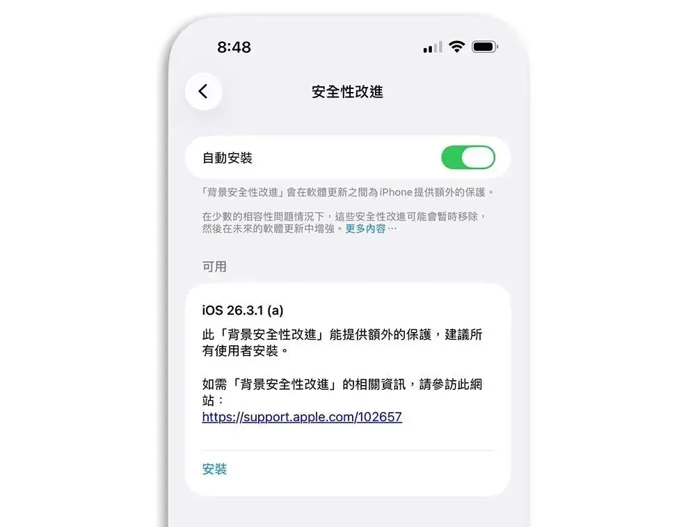 如果已经更新到iOS 26.3.1 的使用者,可以从「设定」→「隐私权和安全性 →「背景安全性改进」功能中点选安装来进行更新。