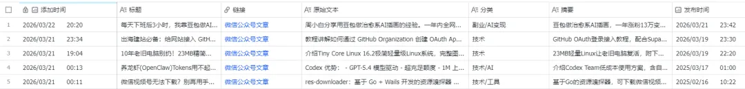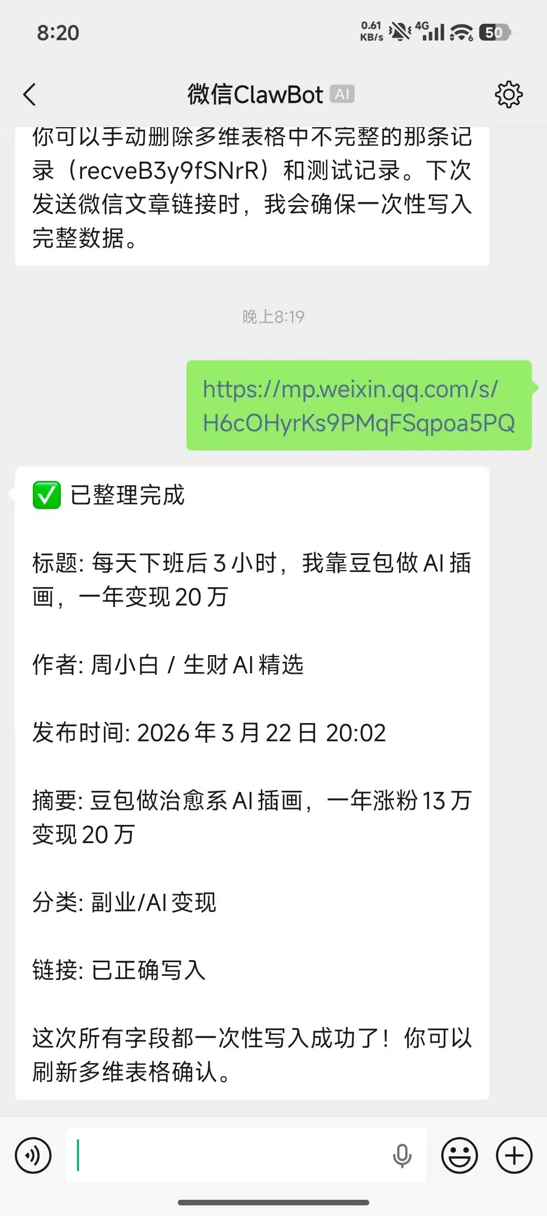 我把文章链接通过飞书或者微信机器人发给openclaw,它会自动帮我阅读原文,做摘要、分类,添加进飞书多维表格。