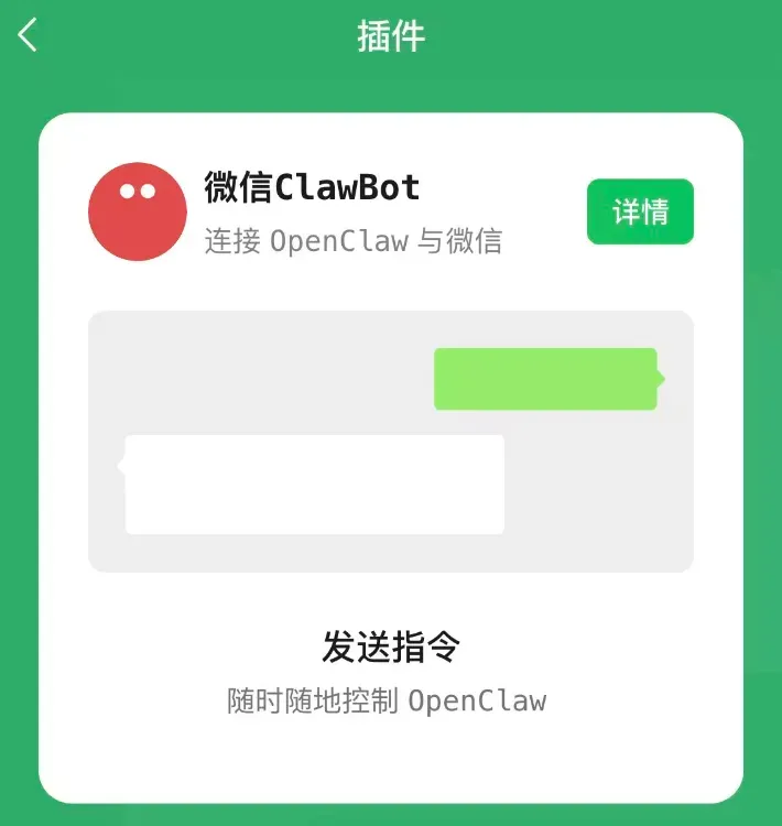 首先,在微信的设置-插件,现在里面多了一个「微信 ClawBot」的插件,这个插件可接入 OpenClaw,用户只需在 OpenClaw 中运行它里面的口令,随后扫码识别即可接入。