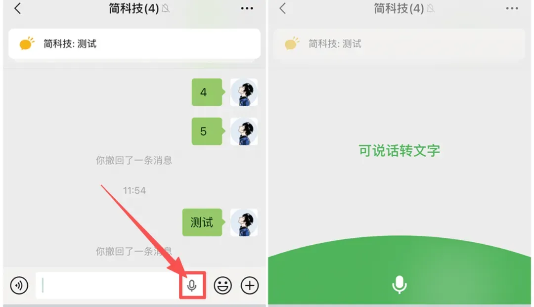 更新后语音转文字有新界面,就是输入框右侧有个麦克风按钮,之前这个按钮仅支持单点,但现在支持长按,而且还有了新的界面,长按后用户对着手机说话,松开后它会自动转文字并发送,上滑则是取消。