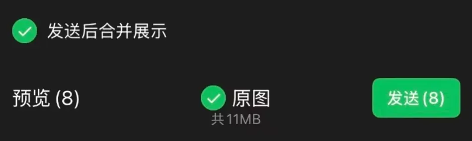 这个功能就是用户给好友发送图片时选择了 3 张及以上的图片后,手机界面左侧会有一个「发送后合并展示」的选项,勾选后图片会以“折叠”的形式发送。