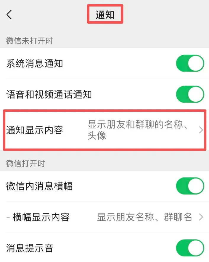 最后就是关于“锁屏显示头像”功能,这个功能目前基本已经全面覆盖了,毕竟我的 iOS、安卓微信都有了这个功能,该功能在手机的设置-通知-通知显示内容,进入后打开可根据需求选择想要显示的内容。
