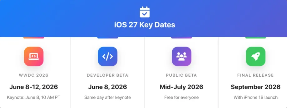 每年 WWDC 都是个节点, 今年卡在 6 月 8 日, WWDC 2026 台上把 iOS 27 拉开, 说的是跨版本大更新, 会后开发者测试版直接推。