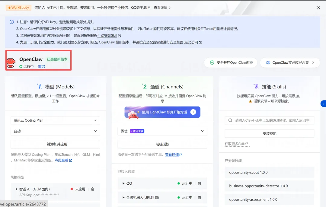 整个过程基本是可视化的,不需要碰代码。如果你要给非腾讯系的龙虾类配置微信,也是可以的,只不过要用下代码了。