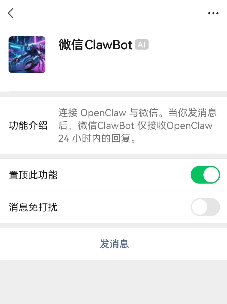不知道是不是我手机的特例,我遇到了一个有趣的bug:绑定成功后,即使我已经将它制定,Clawbot也并没有像我其他朋友的手机一样,稳定地出现在我的微信聊天列表里。我需要手动在微信顶部的搜索框输入“Clawbot”才能把它找出来。它似乎有点“害羞”,不会主动出现在对话列表中。不知道有没有其他朋友遇到同样的情况?