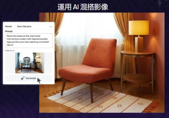通过Nano Banana强大Al模型实现近乎即时的照片编辑。在Al生成工具栏的"重混图像"选项卡中,快速编辑与转换图像:设计效果图、替换元素、将主体置入新场景。